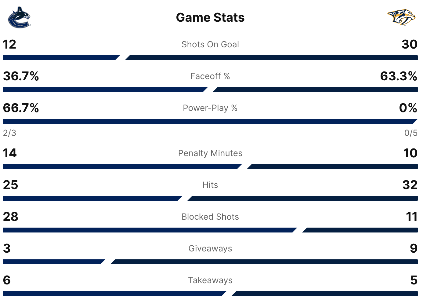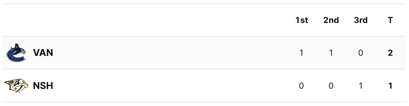 This was a close game. The Predators just couldn’t get that edge to tie it up. The Canucks were able to hold onto their lead pretty well. Winning a game with only twelve shots is crazy. The Canucks were able to come into Nashville and get the win. Now they lead the series.