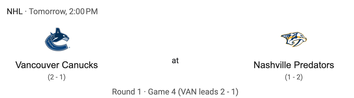 Game four of this series will be on Sunday, April 28th. Puck drop is set for 2:00 PM. The game will be in Nashville.