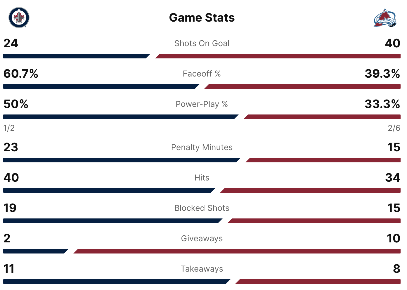 The Avalanche came back to win this game. The Jets fell apart in the third period. It was not a good look for the Jets moving forward in this series. The Avalanche have the lead but It’s still anyones series.