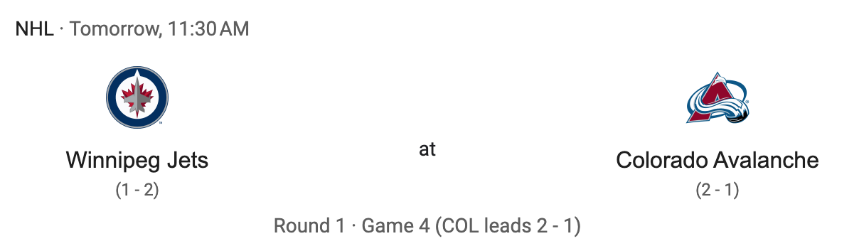 Game four of this series will be on Sunday, April 28th. Puck Drop is set for 11:30 AM. That game will be in Colorado.