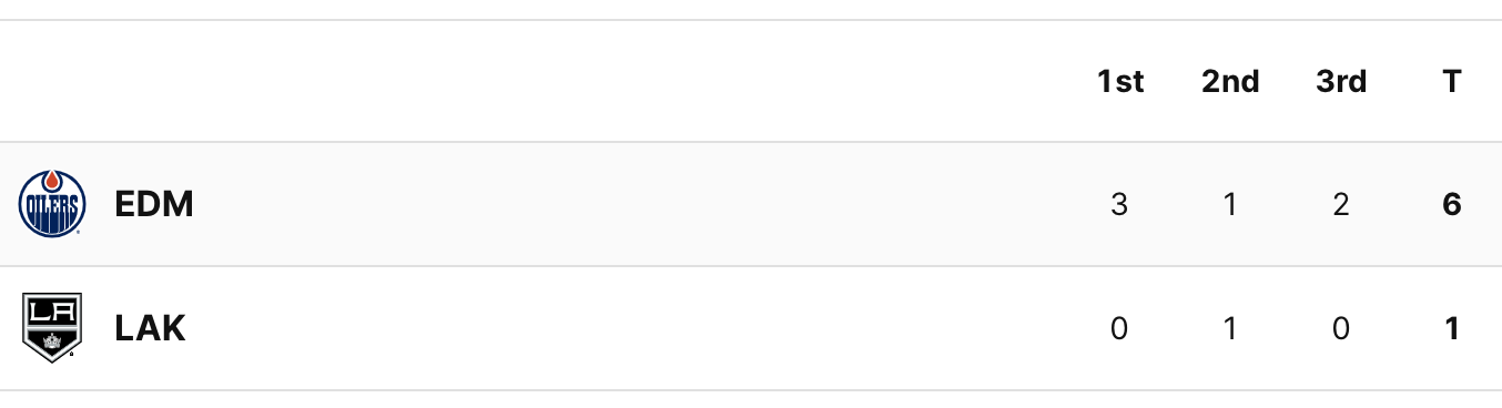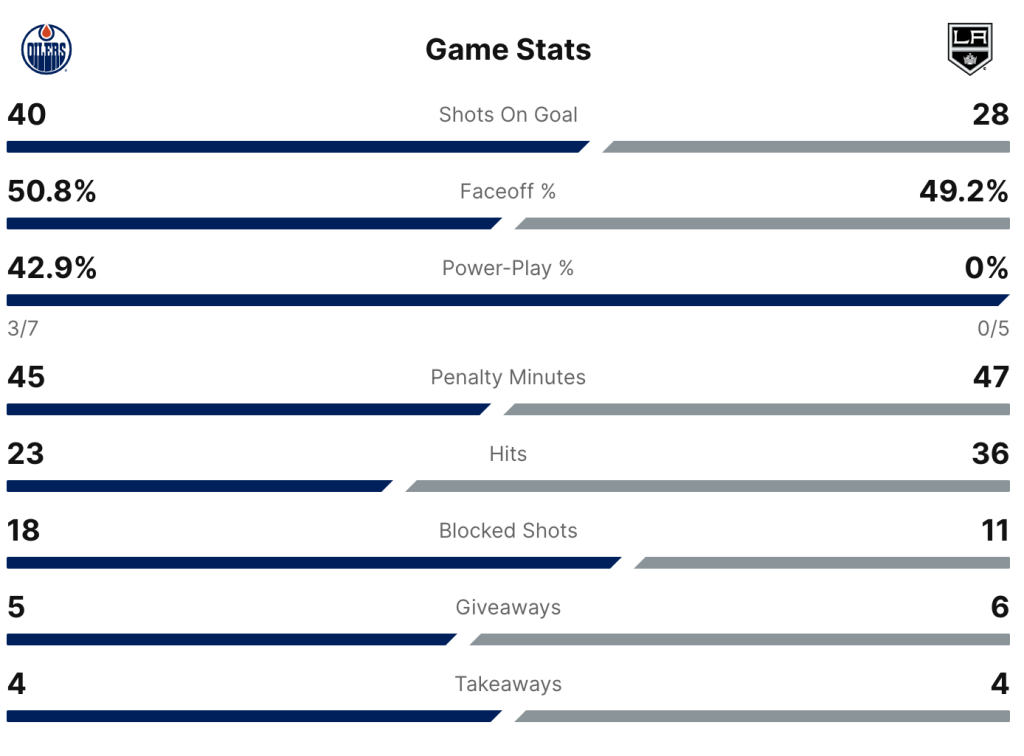 Six minutes into the second period, the Kings got on the board with a goal from #8 Drew Doughty. His goal was assisted by #55 Quinton Byfield and #44 Mikey Anderson. Two minutes laters the Oilers regained their three goal lead. #91 Evander Kane scored. #5 Cody Ceci and #93 Ryan Nugent-Hopkins got the assists. The score was 4-1 Oilers going into the third period.