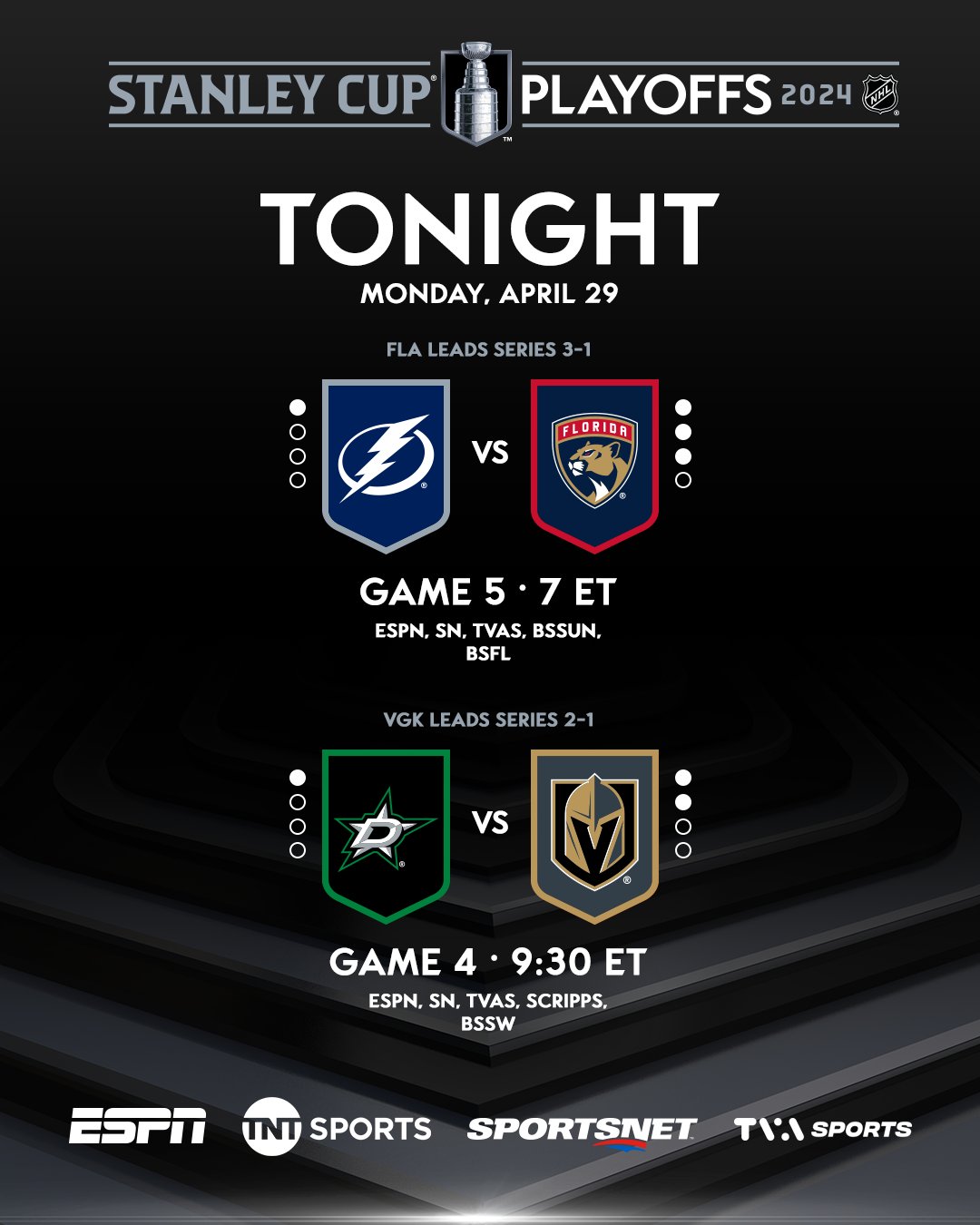 The Stanley Cup Playoffs continued yesterday with four games. The Winnipeg Jets were looking to tie their series with the Colorado Avalanche. The Nashville Predators were looking to tie their series with the Vancouver Canucks. The New York Rangers had a chance to sweep the Washington Capitals. The Los Angeles Kings had a chance to tie their series with the Oilers. There are only two games scheduled for tonight. The Florida Panthers are looking to close out their series with the Tampa Bay Lightning. The Dallas Stars take on the Vegas Golden Knights.