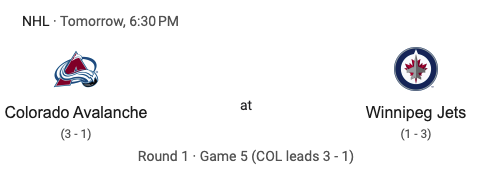 The Avalanche were propelled to a win after four unanswered goals. The Jets were not in this one. Now they face elimination. The Jets have lost three straight games to the Avalanche. The Jets are not in this series. This series so far has been a complete collapse for the Jets after a solid game one. If the Avalanche win game five they will eliminate the Jets. Game five is a must win for the Jets or their season will be over.