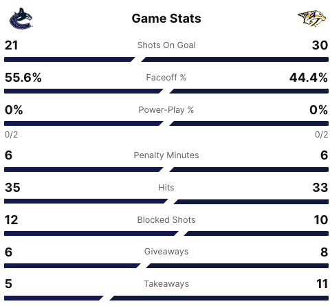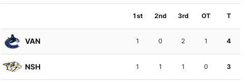 Less than twenty seconds into the third period, #9 Filip Forsberg scored for the predators to take a two goal lead. His goal was assisted by #59 Roman Josi and #27 Ryan McDonagh. With under three minutes left in the game, #6 Brock Noeser scored his second goal of the game for the Canucks. His goal was assisted by #23 Elias Lindholm and #9 J.T. Miller. #6 Brock Boeser scored to complete his hat trick and tie the game with eight seconds left in the game. #9 T.J. Miller and #40 Elias Pettersson got the assists. The score was 3-3 after regulation time. The game would go into overtime. #23 Elias Lindholm scored the game winning goal just over a minute into overtime. His goal was assisted by #8 Conor Garland and #81 Dakota Joshua. The final score was 4-3 Canucks. The Vancouver Canucks now have a 3-1 series lead.