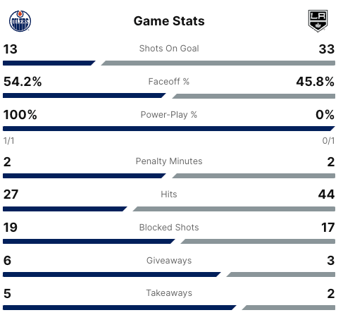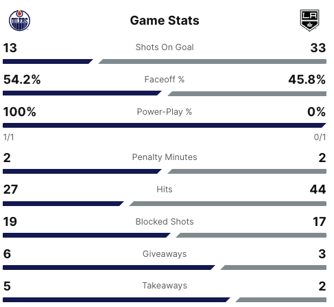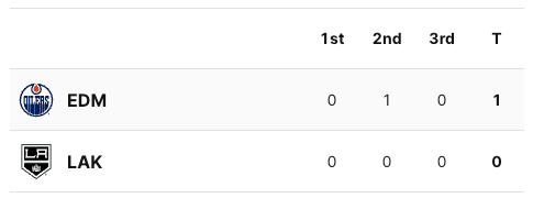 The Edmonton Oilers played the Los Angeles Kings in game four of their first round series. The Oilers were up 2-1 in the series going into the game. The game was in Los Angeles. Neither team scored in the first period. The score was 0-0 after the first period.