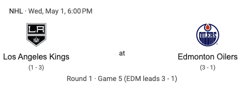 Game five of this series will be on Wednesday, May 1st. Puck drop is set for 6:00 PM. The game will be in Edmonton.