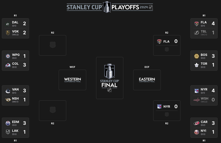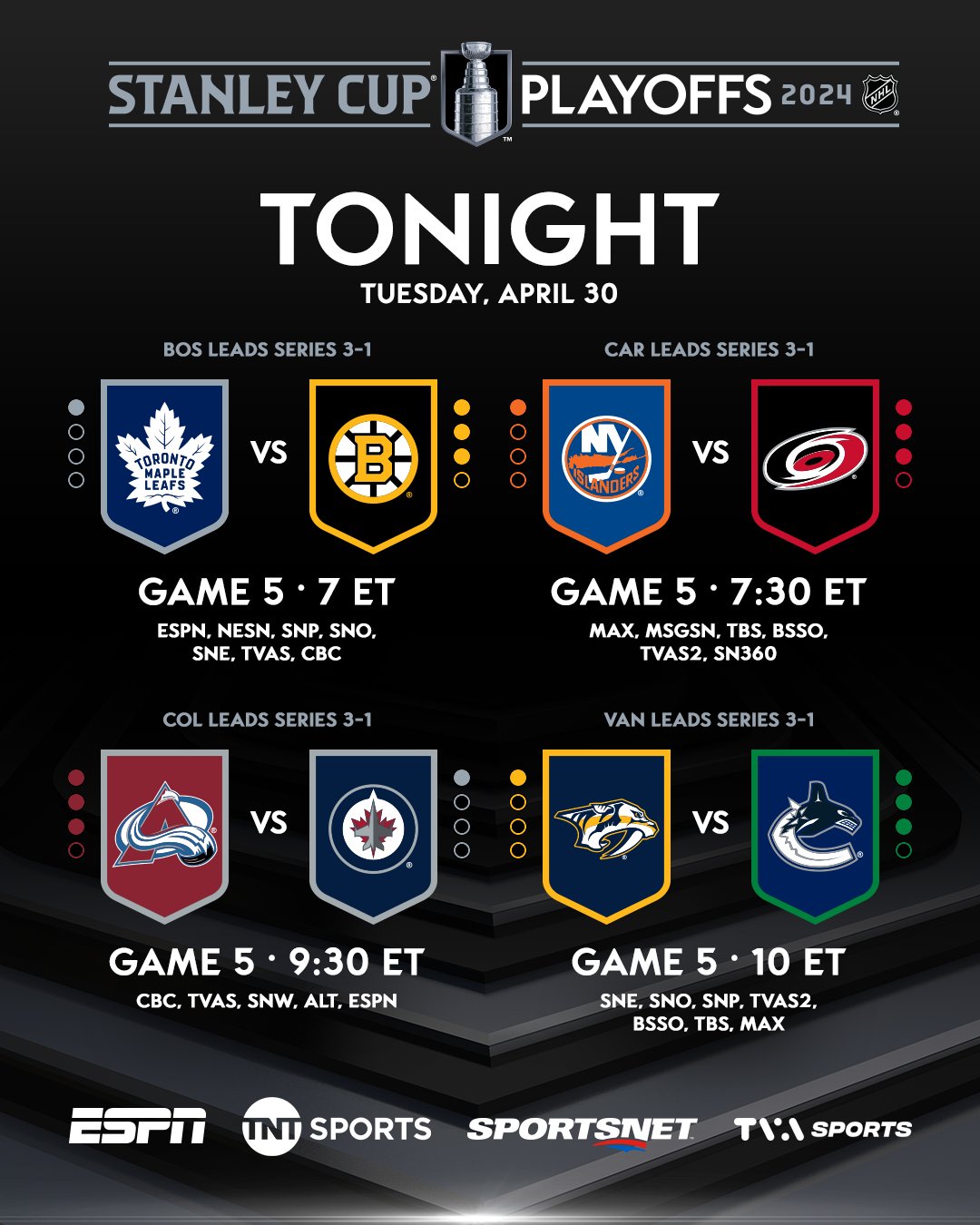 The Stanley Cup Playoffs continued yesterday with two games. The Florida Panthers were looking to close out their series with the Tampa Bay Lightning. The Dallas Stars were looking to tie their series with the Vegas Golden Knights. There are four games going on tonight. Four teams are facing elimination tonight. The Boston Bruins will look to eliminate the Toronto Maple Leafs. The Carolina Hurricanes have the chance to eliminate the New York Islanders. The Colorado Avalanche can eliminate the Winnipeg Jets. The Vancouver Canucks can eliminate the Nashville Predators.