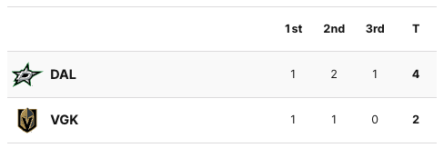 Four minutes into the second period, #9 Jack Eichel scored for the Vegas Golden Knights to take the lead. #81 Jonathan Marchessault and #49 Ivan Barbashev got the assists on that goal. Halfway through the second period, #53 Wyatt Johnston scored for the Dallas stars ti tie the game. His goal was assisted by #95 Matt Duchene and #91 Tyler Seguin. With less than two minutes to go in the second period, #10 Ty Dellandrea scored for the stars to take the lead. His goal was assisted by #16 Craig Smith and #18 Sam Steel. The score was 3-2 Stars going into the third period.