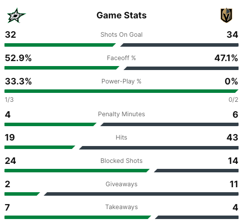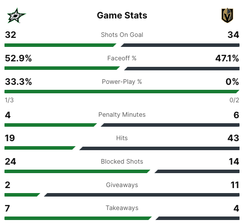 #24 Roope Hintz scored an unassisted goal to give the Stars a two goal lead. His goal came with less than two minutes left in the game. The final score was 4-2 Stars. The series is now tied up at 2-2.