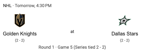 Game five of this series will be on Wednesday, May 1st. Puck drop is set for 4:30 PM. The game will be in Dallas.
