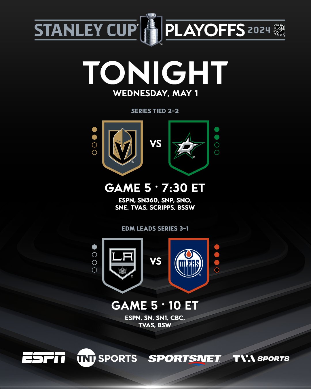 The Stanley Cup Playoffs continued yesterday with four games. Four teams were facing elimination. The Boston Bruins had the chance to win their series over the Toronto Maple Leafs. The Carolina Hurricanes were looking to eliminate the New York Islanders. The Colorado Avalanche were trying to win four straight games to eliminate the Winnipeg Jets. The Vancouver Canucks had an opportunity to eliminate the Nashville Predators. There are two games tonight. The Dallas Stars take on the Vegas Golden Knights. The Edmonton Oilers have the chance to eliminate the Los Angeles Kings.