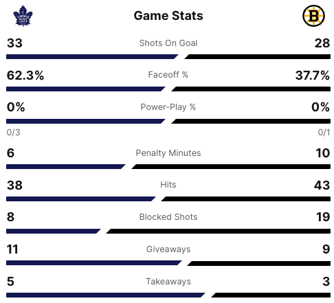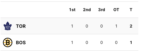 Neither team scored in the second period. The game was tied at 1-1 going into the third period. Nobody scored in the third period. The score remained at 1-1. The game went into overtime. Two and a half minutes into overtime, the Maple Leafs scored. #23 Matthew Knies scored the game winning goal for the Maple Leafs. His goal was assisted by #91 John Tavares and #46 Ilya Lyubushkin. The final score was 2-1 Maple Leafs. The Boston Bruins still lead the series 3-2.