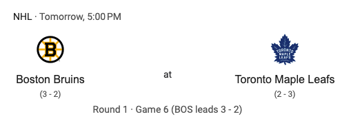 Game six of this series will be on Thursday, May 2nd. Puck drop is scheduled for 5:00 PM. That game will be in Boston.