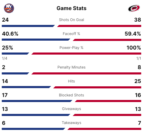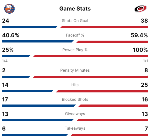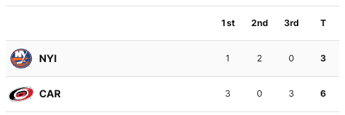 Five minutes into the third period, the Hurricanes took the lead. #18 Jack Drury scored the go ahead goal. His goal was assisted by #76 Brady Skjei and #88 Martin Necas. The Hurricanes took a two goal lead less than ten seconds later. #23 Stefan Noesen scored the goal with #75 Brady Skjei and #92 Evgeny Kuznetsov getting the assists. With just over a minute and a half left in the game, the Hurricanes took a three goal lead. The goal was scored by #24 Sth Jarvis and was unassisted. The final score was 6-3 Hurricanes. The Carolina Hurricanes have won this series 4-1. The New York Islanders have been eliminated from the 2024 Stanley Cup Playoffs.