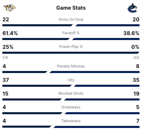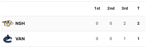 No one scored in the second period. The score was still 0-0 after two periods. Four minutes into the third period, the Canucks took the lead. #91 Nikita Zadorov scored for the Canucks. #34 Quinn Hughes got the assist. About halfway through the third period, the Predators tied the game. #59 Roman Josi scored the tying goal. His goal was assisted by #9 Filip Forsberg and #22 Tyson Barrie. With seven minutes left in the game, the Predators took the lead. #45 Alexandre Carrier scored the goal for the Predators. #24 Gustov Nyquist and #9 Filip Forsberg got the assists. The final score was 2-1 Predators. The Vancouver Canucks still lead the series 3-2.