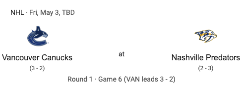 Game six of this series will be on Friday, May 3rd. Puck drop is still to be determined. The game will be in Nashville.
