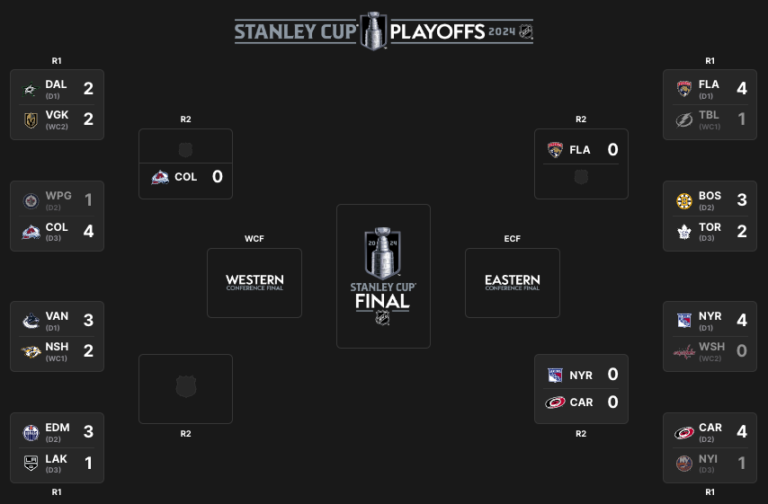The Washington Capitals, Tampa Bay Lightning, New York Islanders, and Winnipeg Jets have been eliminated from the 2024 Stanley Cup Playoffs. The New York Rangers, Florida Panthers, Carolina Hurricanes, and Colorado Avalanche have advanced to the second round.