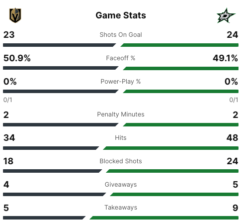 Less than a minute into the third period, #12 Radek Faksa scored to give the stars the lead. His goal was assisted by #15 Craig Smith and #55 Thomas Harley. The final score was 2-1 Stars. The Dallas Stars have won this series 4-3. The Dallas Stars have advanced to the second round. The Vegas Golden Knights have been eliminated from the 2024 Stanley Cup Playoffs.