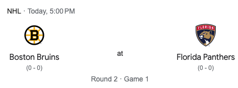 Game one of this series is today. Game one will be in Florida. Puck drop is set for 5:00pm PST. The winner of this series will play the winner of theNew York Rangers vs Carolina Hurricanes series in the Eastern Conference Final.