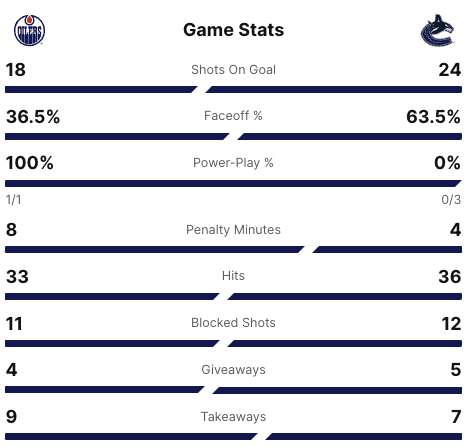 The Oilers held the lead until late in the game. Then the Canucks found two goals to tie and win the game. This was poor display of the defensive capabilities of the Oilers. They had a two goal lead twice and even a three goal lead. They blew it. The Canucks stuck with it to win. Games have played out like this countless times for the Oilers. My biggest take away from this is that it is game one. What happens in game two is more likely to dictate how this series plays out.