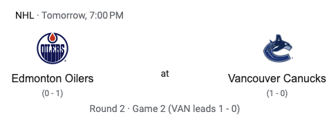 Game two of this series will be on Friday, May 10th. That game will be in Vancouver. Puck drop is scheduled for 7:00 PM.