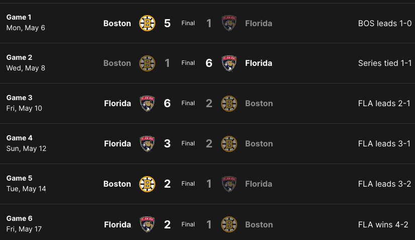 The final three games were all decided by one goal. The only fight in this series was in game two. That was the last fight in the 2024 Stanley Cup Playoffs. This series started out as blowout after blowout. That was followed by close game after close game. The Bruins wanted revenge. They had the best record ever in the NHL heading into the playoffs last season. They almost won that series only to three straight games to the Panthers. During this season they did not let the Panthers win against them. It looked promising after game one. Then the Panthers kicked it up a notch. In the end history repeated itself here.
