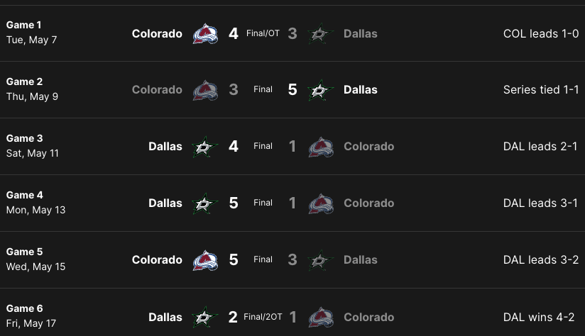 The Avalanche came close to forcing a game seven but they could not find a way to win at home. The Stars went out there and took over game two, three, and four. There was only two one goal games in the whole series. Both teams struggled to win in this series. If one team was leading by three goals they were able to win. If it was a close game, both teams struggled to find a way to win. The only exception was game one but even then when the game got close, both teams struggled. That is something to watch out for with the Dallas Stars moving forward. What this series comes down to is that the Avalanche doomed themselves by not finding home wins.