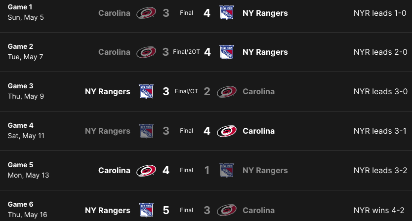 This series was close. Four out of the six games were one goal games. The Hurricanes avoided being swept. This was one of the more entertaining series so far. After game three it looked like the Rangers were unbeatable. That was not the case. The Hurricanes won back to back games to keep the series going. The Rangers kept finding ways to win.