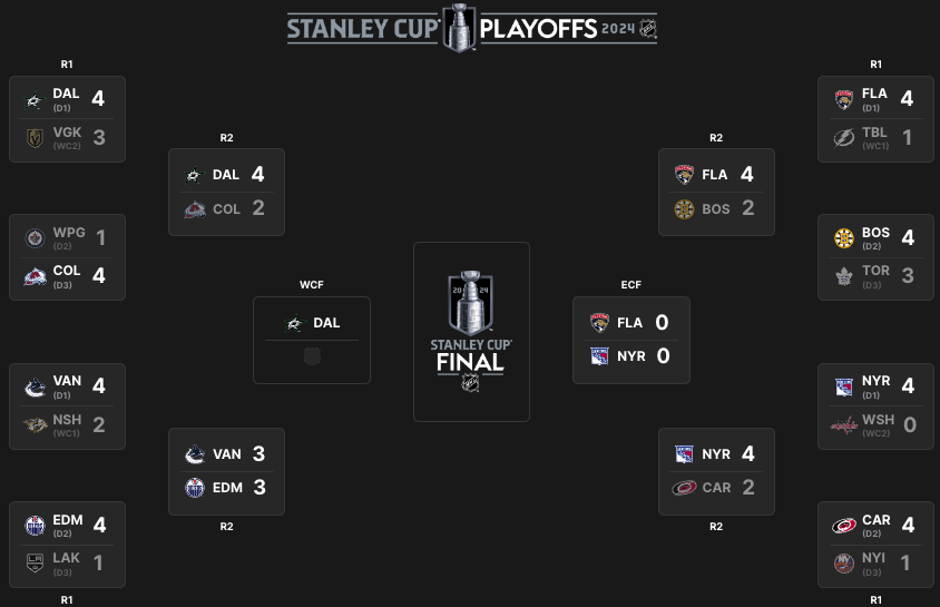 The New York Rangers and Florida Panthers advanced to the Eastern Conference Finals. The Dallas Stars advanced to the Western Conference Finals.