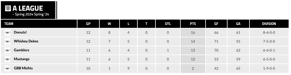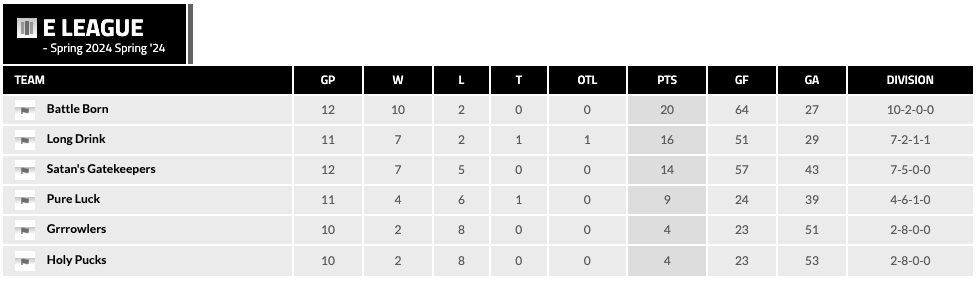 In the E-League, Battle Born, Long Drink, and Satan’s Gatekeepers secured playoff spots. Pure Luck also advanced to the playoffs. The Grrrowlers and Holy Pucks were eliminated from playoff contention.