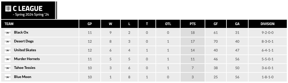 In the C-League, Black Ox and the Desert Dogs secured playoff spots. The Murder Hornets and United Skates also advanced to the playoffs. The Tahoe Tessies and Blue Moon were eliminated from playoff contention.