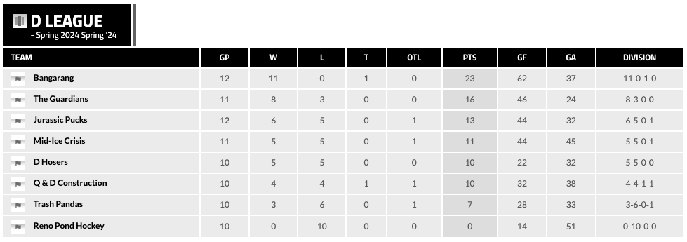 In the D-League, Bangarang, The Guardians, and Jurassic Pucks secured playoff spots. Mid-Ice Crisis also advanced to the playoffs. The Reno Fire Hosers D, Q & D Construction, the Trash Pandas, and Reno Pond Hockey were eliminated from playoff contention.