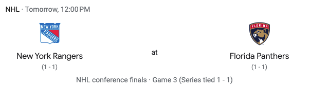 Game three of the Eastern Conference Finals will be on Sunday, May 26th at 12:00 PM. That game will be in Florida.