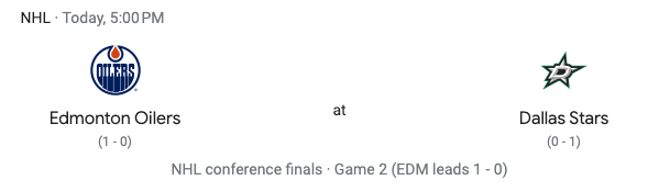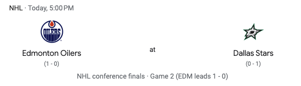 The Dallas Stars take on the Edmonton Oilers in game two of the Western Conference Finals. The Oilers have a 1-0 series lead after winning game one 3-2 in double overtime. This game is in Dallas. Puck drop is scheduled for 5:00 PM. Will there be more overtime? Will the Stars tie the series? Will the Oilers continue to find a way to win?