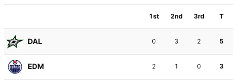 The Dallas Stars took on the Edmonton Oilers in game three of the Western Conference Finals. The series was tied at 1-1 going into the game. Edmonton won game one 3-2 in overtime. Dallas won game two 3-1. This game was in Edmonton. Just over two minutes into the game, #18 Zach Hyman scored to give the Oilers the lead. His goal was assisted by #97 Connor McDavid and #2 Evan Bouchard. Halfway through the first period, #97 Connor McDavid scored an unassisted goal to give the Oilers a two goal lead. The score was 2-0 Oilers after the first period.