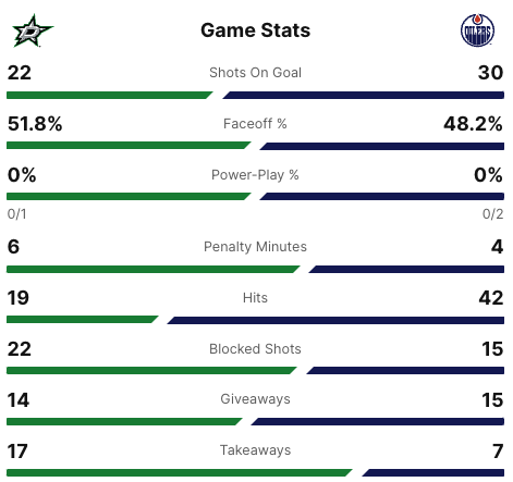Six minutes into the second period, #21 Jason Robertson scored for the Stars to bring the lead back down to one goal. His goal was assisted by #24 Roope Hints and #91 Tyler Seguin. With just under twelve minutes to go in the second period, #21 Jason Robertson scored again for the Stars to tie the game. His goal was assisted by #24 Roope Hintz. A minute later, Wyatt Johnston scored to give the Stars the lead. His goal was assisted by #11 Logan Stankoven and #14 Jamie Benn. With under a minute to go in the period, #19 Adam Henrique scored for the Oilers to tie the game. His goal was assisted by #28 Connor Brown. The score was tied up at 3-3 going into the third period.