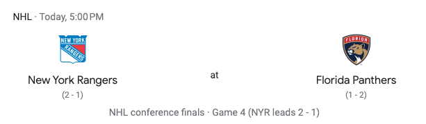 The New York Rangers take on the Florida Panthers in game four of the Eastern Conference Finals. The Rangers are leading the series 2-1. This game is in Florida. Puck Drop is scheduled for 5:00 PM. Will the Rangers take a 3-1 series lead? Will the Panthers find a way to win at home?