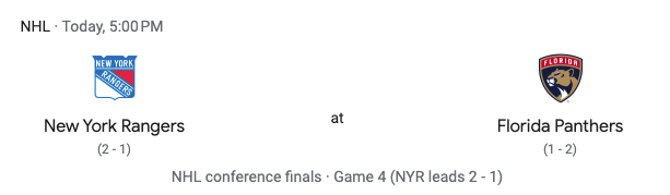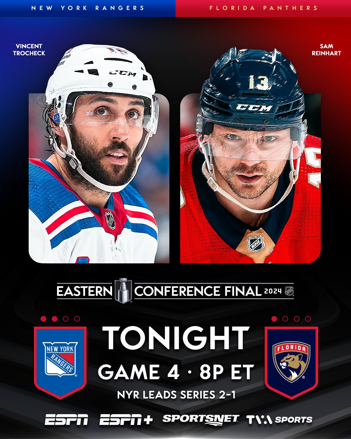The New York Rangers take on the Florida Panthers in game four of the Eastern Conference Finals. The Rangers are leading the series 2-1. This game is in Florida. Puck Drop is scheduled for 5:00 PM. Will the Rangers take a 3-1 series lead? Will the Panthers find a way to win at home?