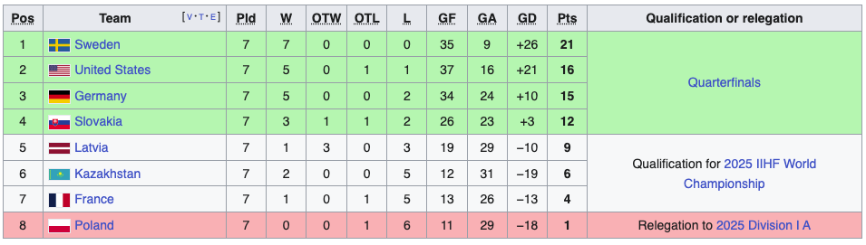 In Group A was Canada, Switzerland, the Czech Republic, Finland, Austria, Norway, Denmark and Great Britain. In Group B was Sweden, the United states, Germany, Slovakia, Latvia, Kazakhstan, France, and Poland. Canada won Group A. Switzerland, the Czech Republic, and Finland also advanced to the elimination stage. Sweden won Group B. The United States, Germany, and Slovakia also advanced to the elimination stage. Great Britain and Poland came in last in their groups. As a result they were relegated for 2025. Canada and Sweden were the only teams to not lose a game during the group stage.