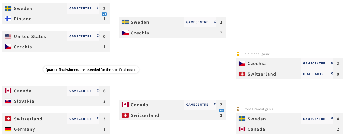 In the first Semifinal game, The Czech Republic beat Sweden 7-3. After a tied first period, the Czech Republic put on an impressive offensive display to win the game. Sweden couldn’t keep up. The Czech Republic made the Gold Medal Game for the first time since 2010. Sweden went on to play in the Bronze Medal Game. It was Swedens first time in the Bronze Medal Game since 2014. Switzerland upset Canada in the second Semifinal game, Switzerland beat Canada 3-2 in a shootout. Switzerland advanced to the Gold Medal Game. This was the first time Switzerland was in the gold medal game sin 2018. This was the first time since 2018 that Canada was in the Bronze Medal Match.