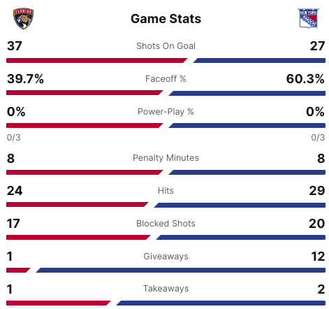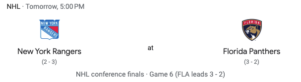 This was yet another close game. The Rangers almost came back to tie the game. This is the fourth game in a row in this series that was decided by on goal. Now both teams have won back to back games. the Panthers have won more games in New York in this series than the Rangers have. The Panthers will have the first opportunity to win the Eastern Conference Finals and advance to the Stanley Cup Finals in game six.