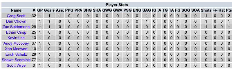 Goals – #26 Kevin Sawyer, #28 Zac Seidemann (C), #32 Greg Scott