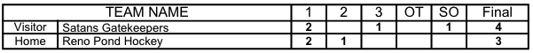 2. […] Pond Hockey was coming off of a 3-4 Shootout loss to Satan’s Gatekeepers. Reno Pond Hockey had a record of 0-0-1 going into the game. They were in […]