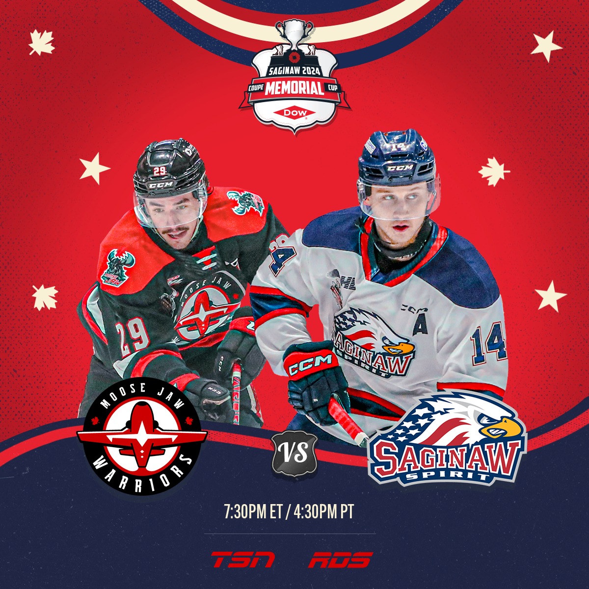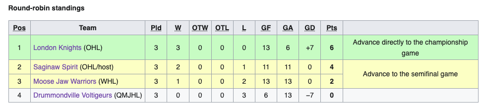 The London Knights qualified for the Memorial Cup as the 2024 OHL Champions. The Drummondville Voltigeurs qualified for the Memorial Cup as the 2024 QMJHL Champions. The Moose Jaw Warriors qualified for the Memorial Cup as the 2024 WHL Champions. The Saginaw Spirit qualified for the Memorial Cup as the hosts. The London Knights won the round robin stage with a record of 3-0. As a result they advanced directly into the championship game. The Saginaw Spirit came in second during the round robin stage with a record of 2-1. The Moose Jaw Warriors came in third in the round robin stage with a record of 1-2. The Saginaw Spirit and Moose Jaw Warriors both advanced to the semifinal game. The Drummondville Voltigeurs went 0-3 and were eliminated in the round robin stage.