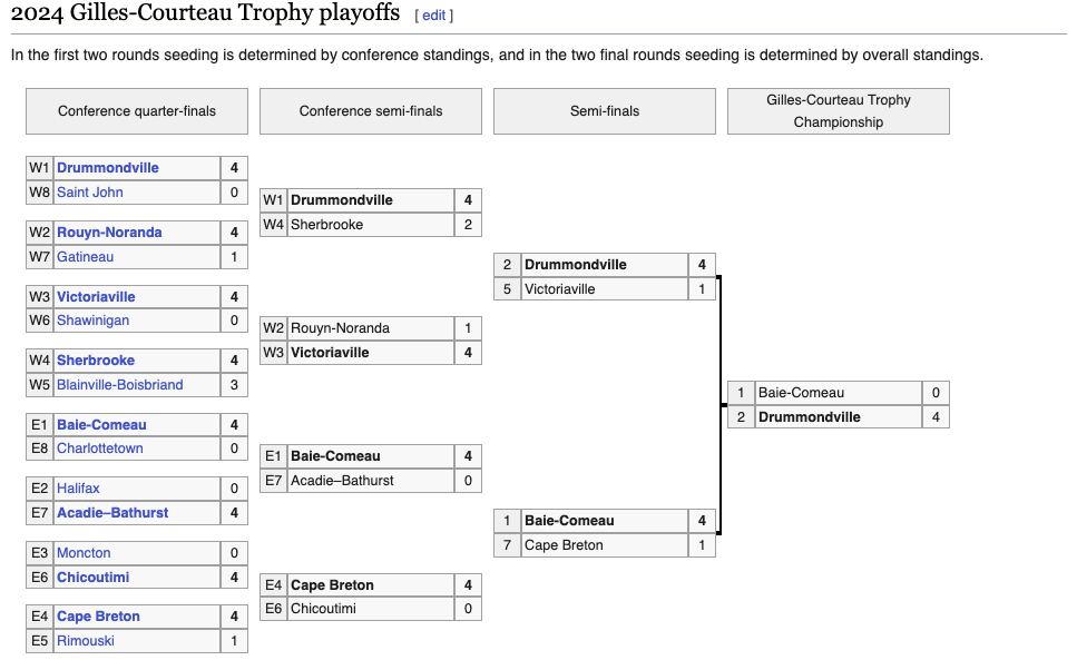 The Drummondville Voltigeurs played the Baie-Comeau Drakkar in the QMJHL finals. The Drummondville Voltigeurs won the series 4-0. The Drummondville Voltigeurs are the 2024 QMJHL Champions. In four series they only lost three games. This was their first QMJHL Championship since 2009. This was their second QMJHL Championship. They advanced to the CHL Memorial Cup. This was their first Memorial Cup since 2009.