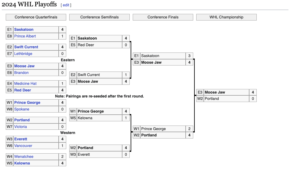 The Moose Jaw Warriors took on the Portland Winterhawks in the WHL Championship. The Moose Jaw Warriors defeated the Portland Winterhawks 4-0. This sweep would mark the first time in CHL history that all three league finals were swept. The Moose Jaw Warriors are the 2024 WHL Champions. In four series they only lost four games. This was their first ever WHL Championship. They advanced to the CHL Memorial Cup for the first time ever.