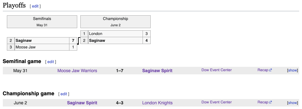 The Moose Jaw Warrior of the WHL took on the Saginaw Spirit of the OHL in the Memorial Cup Semifinal game. The score was tied at 1-1 after the first period. Saginaw scored five goals in the second period to take a 6-1 lead into the third period. The final score was 7-1 Saginaw. The Saginaw Spirit advanced to the Memorial Cup Final. The Moose Jaw Warriors were eliminated.
