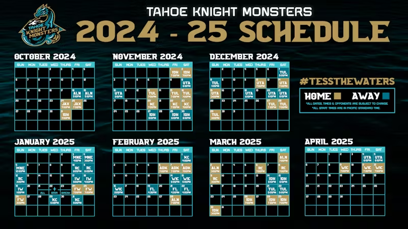 The Tahoe Knight Monsters just announced their schedule for their inaugural season. The entire ECHL announced their schedule today. The ECHL also announced their alignment for the 2024-25 season. The Tahoe Knight Monsters will play seventy two games. They will have thirty six home games and thirty six away games. The Knight Monsters will open up the season on October 18th and 19th in Texas against the Allen Americans. Their home opener is on Thursday, October 24th, 2024. That game will be against the Jacksonville Icemen.