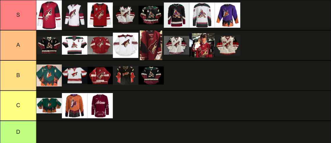 The Coyotes had twenty jerseys in their twenty five year history. Above are my rankings for the jerseys. The Coyotes never had a terrible jersey. They did have quite a few fantastic jerseys. The best Coyotes era was from 2015 to 2021. They did hit it out of the park with their 2021 reverse retro jersey.