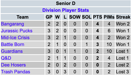 Bangarang continue to lead the D-League power rankings. They remain undefeated after a week three win. The Guardians are second in the power rankings. They were still undefeated after week two. Battle Born are third in the power rankings. They were still undefeated in regulation after a win in week three. The Jurassic Pucks are fourth in the power rankings. They moved down after a loss in week three broke their undefeated record. Mid-Ice Crisis moved up to the fifth spot after a win. Q & D Construction moved down after their first loss of the season. The Reno Fire Hosers D stayed in the seventh spot after back to back losses to start the season. The Trash Pandas stayed in the last spot after losing their first two games of the season.